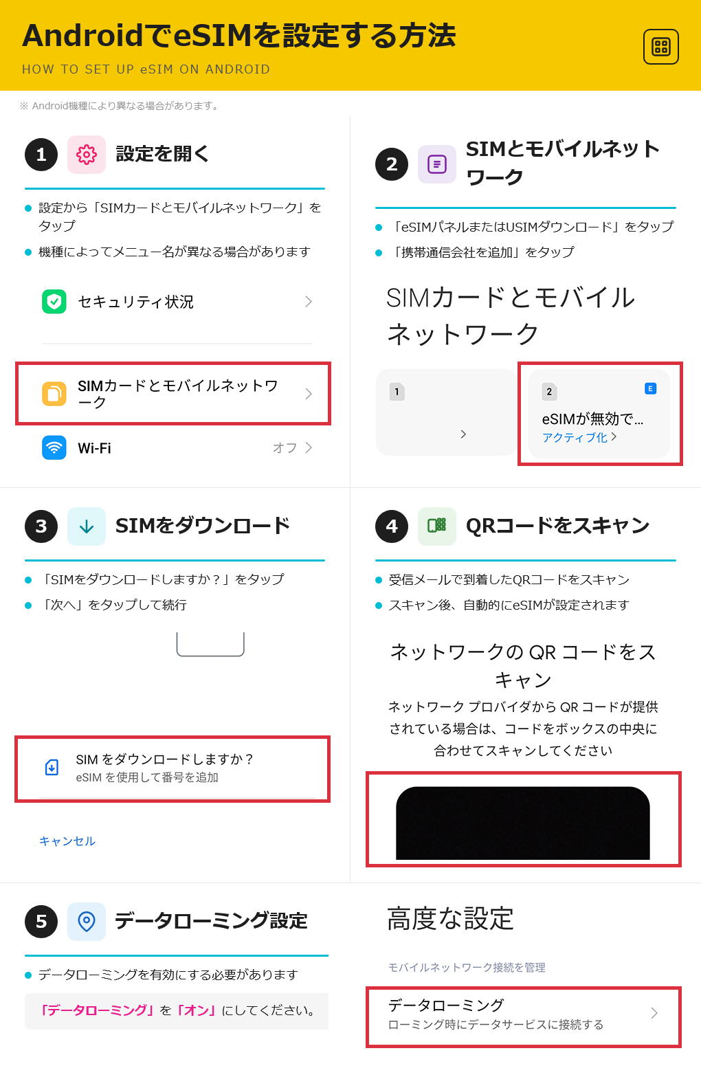 Android : 設定 → ネットワークとインターネット → SIM → eSIMを追加 → QRコードをスキャン → データローミング「オン」