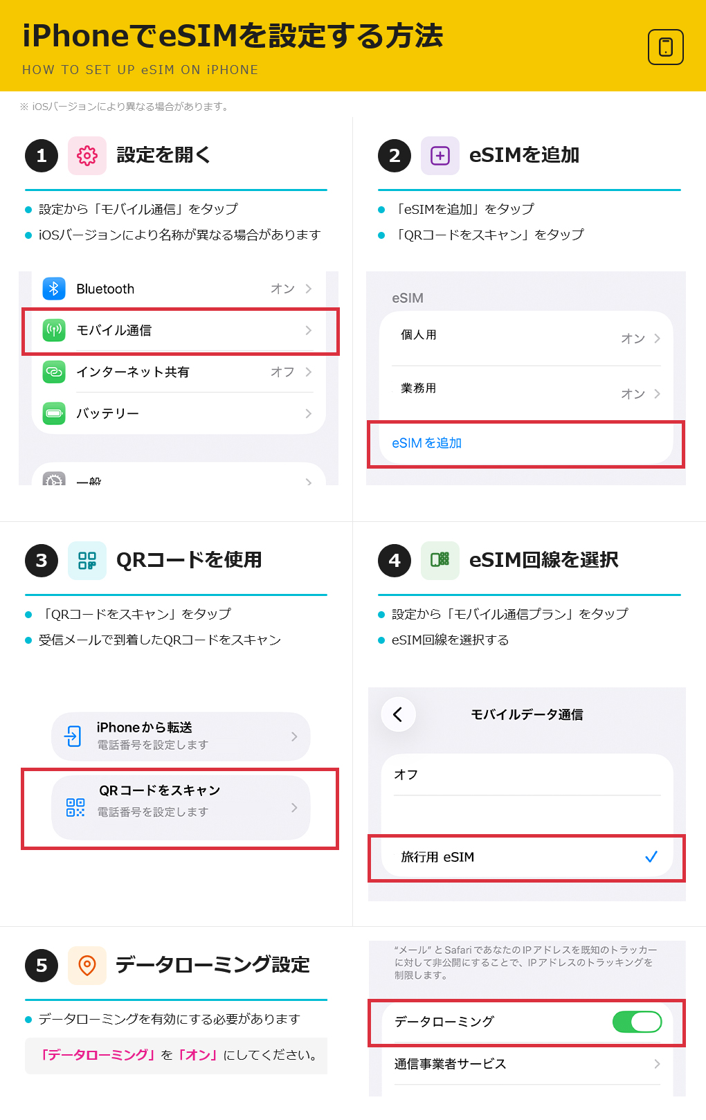 iOS : 設定 → モバイル通信 → eSIMを追加 → QRコードを使用 → QRコードをスキャン → データローミング「オン」